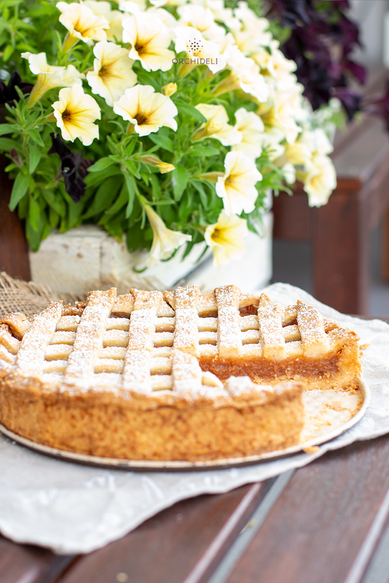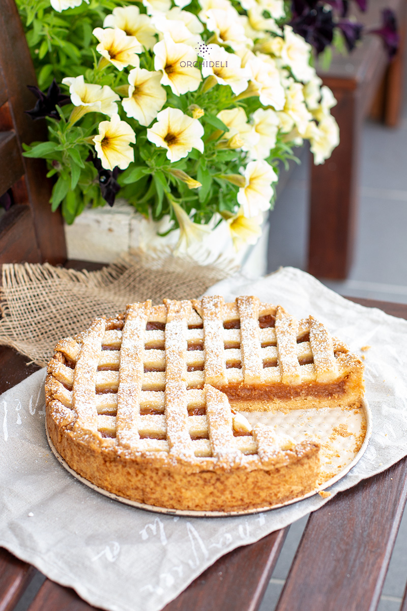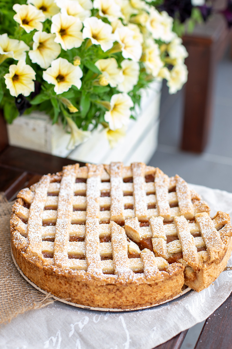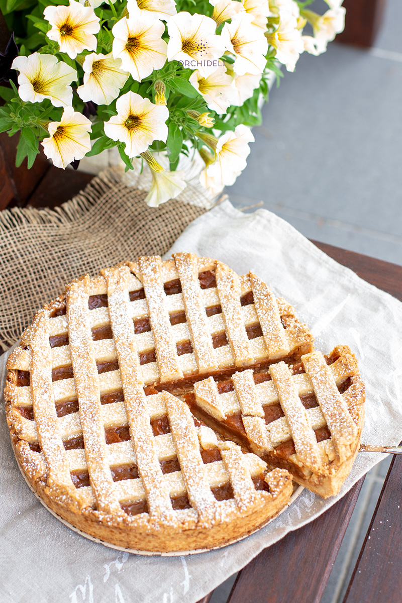 Bierzemy co drugi pasek, zaczynając z brzegu i układamy pionowo na cieście, zostawiając odstępy. Pozostałe paski układamy w poprzek, tak aby powstał wzór kratki.