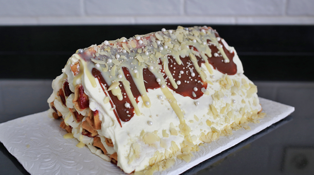 - Układamy kolejne 4 rurki w zagłębieniach pomiędzy pierwszą warstwą. Smarujemy kremem i układamy kolejne 3 szt.