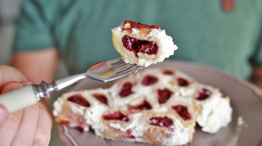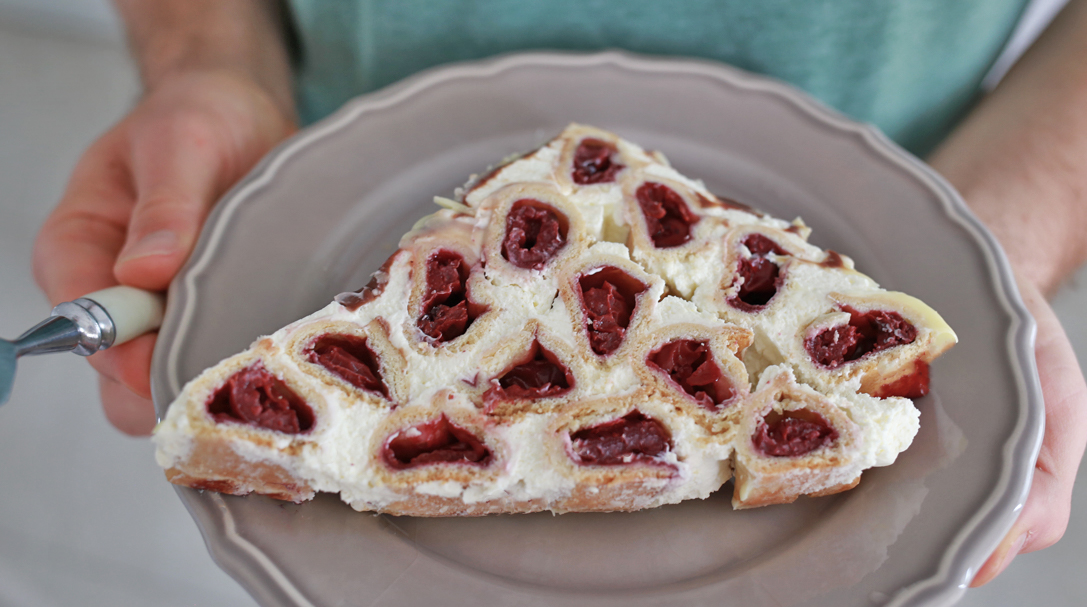 Wiśniowa góra – pod tą uroczą nazwą kryje się kruche ciasto nadziewane wiśniami i zanurzone w bitej śmietance. Smakuje dokładnie tak jak wygląda, czyli jest po prostu pyszne. Słodkość śmietany bardzo dobrze komponuje się z kwaskowatymi wiśniami.