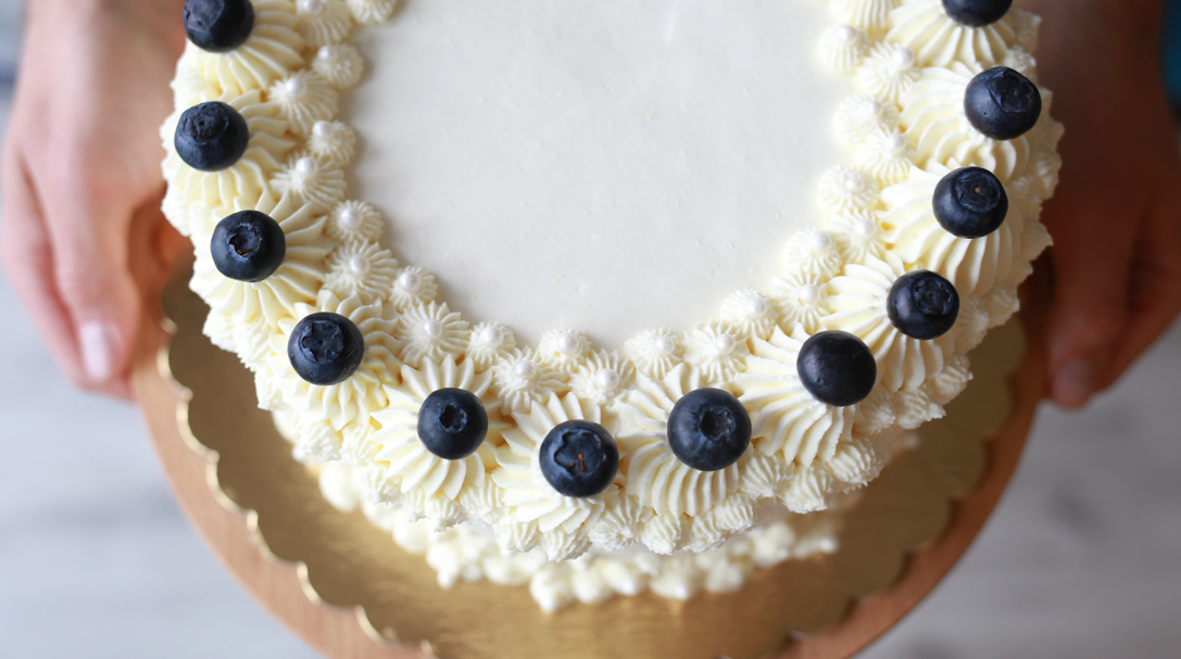 - Resztą kremu napełniamy rękaw cukierniczy i dekorujemy tort.