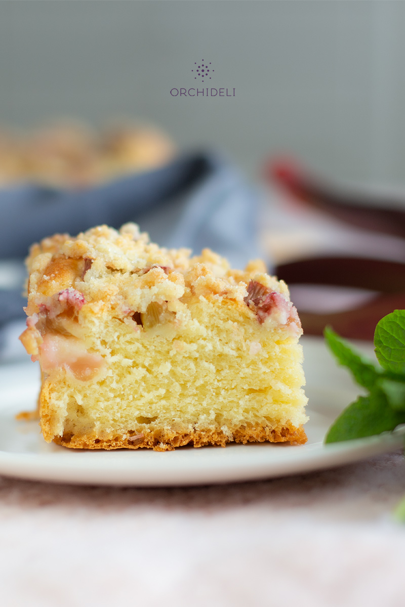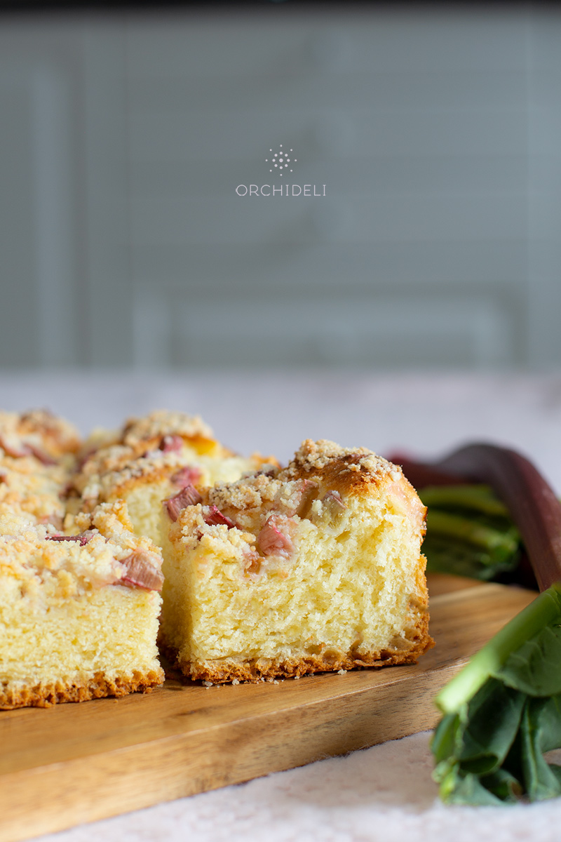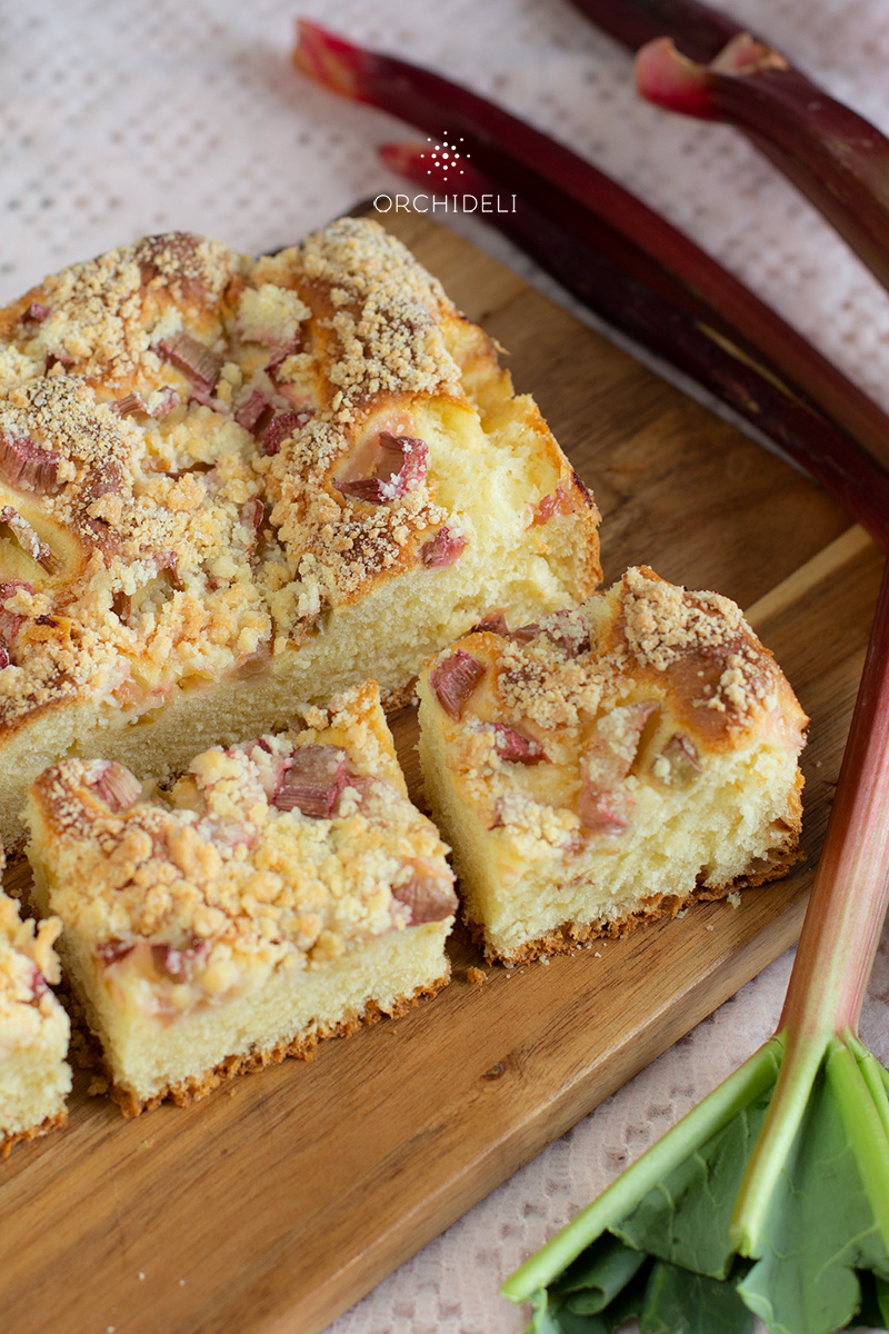 - Rabarbar umyj i pokrój na 1-2 cm kawałki (nie musisz go obierać, jeśli ma ładną skórkę), po czym ułóż go na wierzchu ciasta.
