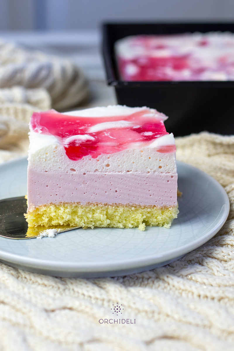 - Końcem łyżki zrób okrągłe wzory na wierzchu ciasta, tak aby galaretka wymieszała się z bitą śmietaną, tworząc mozaikę.
