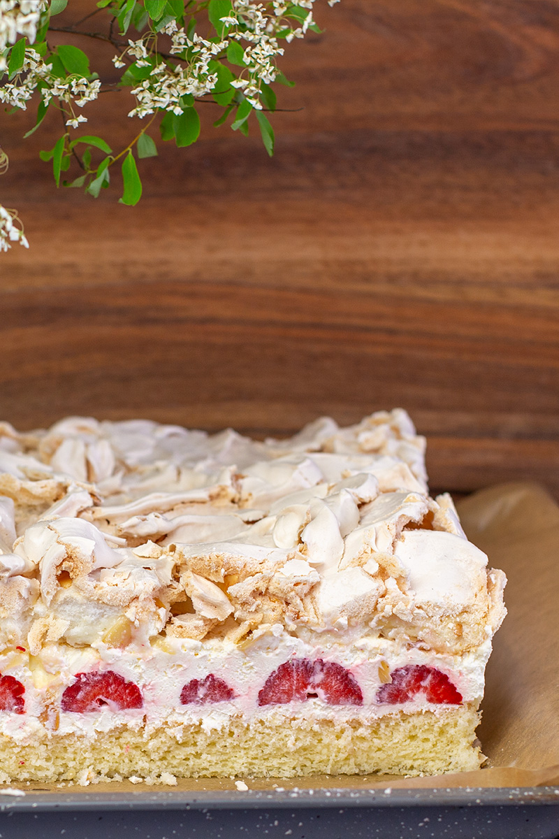 - Następnie odstaw mikser na bok i dodaj budyń. Całość dokładnie wymieszaj, dodaj płatki migdałów i znów wymieszaj. Wymieszaną pianę przełóż do wyłożonej papierem blaszki. Wierzch wyrównaj z grubsza.