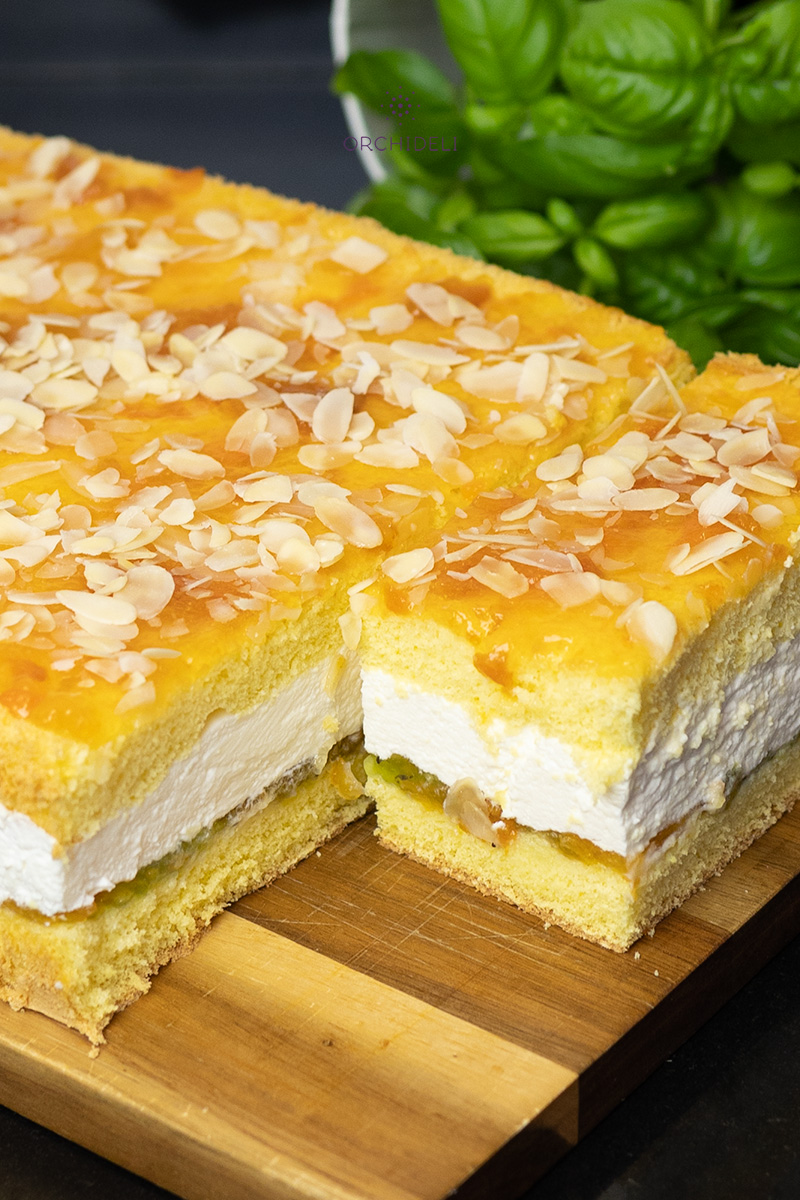 - Na dżem wyłóż cały krem, u mnie w trakcie przygotowań krem już trochę zaczął zastygać, więc warto pracować sprawnie. Całość wyrównaj i przykryj drugim blatem biszkoptowym. Wierzch nasącz i wyłóż trzeci słoiczek dżemu u mnie morelowego, równo rozsmarowując.