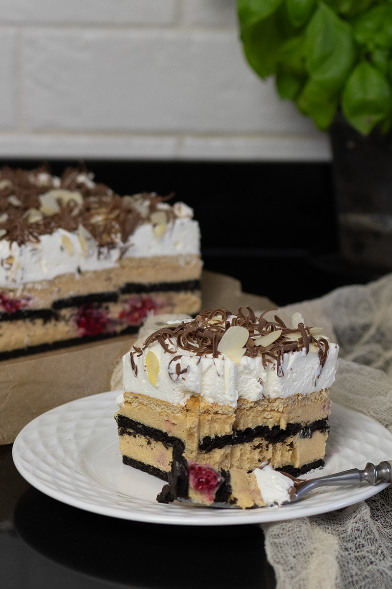 - Następnie na wierzchu ułóż kolejną warstwę ciemnych herbatników, pozostały krem oraz maliny, powtarzając wszystkie czynności.
