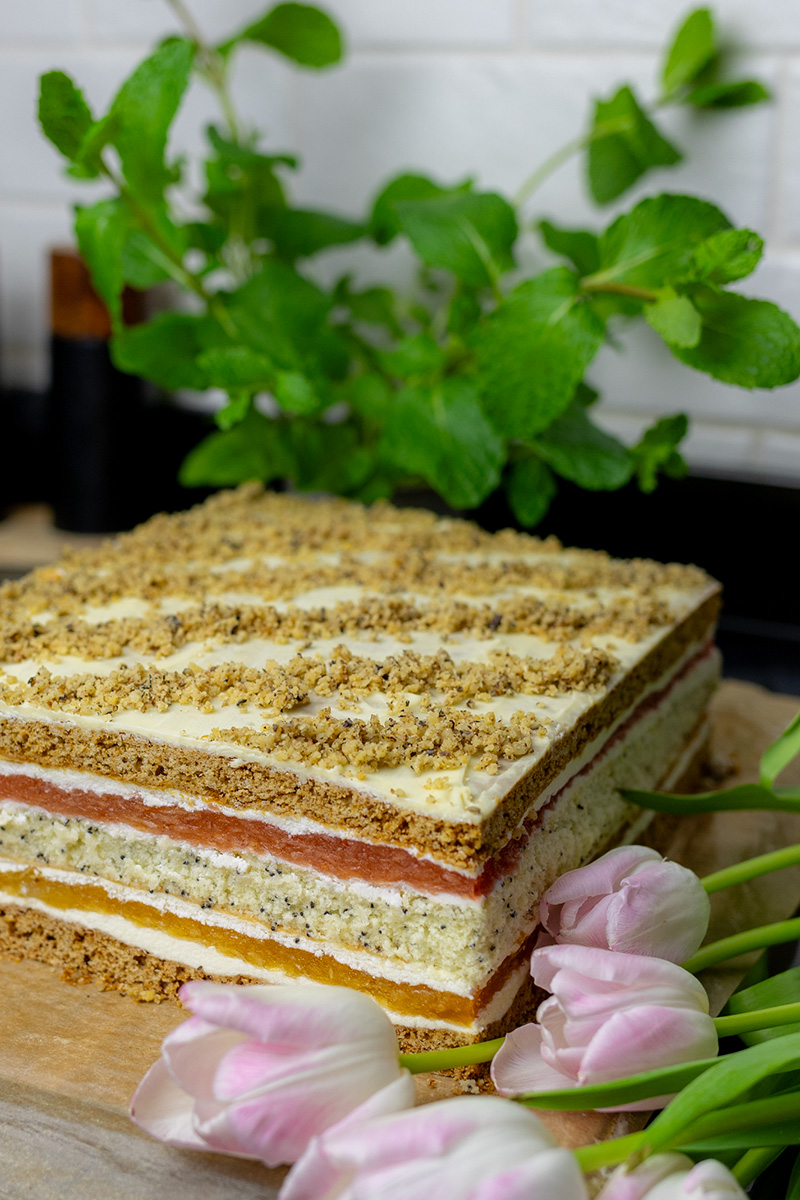 - Ciasto powinno być przechowywane w lodówce, ale bardzo dobrze radzi sobie również poza nią. U mnie po 5 godzinach na stole, wciąż było stabilne i świetnie się kroiło. Jeśli zatem nie masz dużo miejsca w lodówce, a ciasto planujesz zjeść w ciągu 2-3 dni, wystarczy, że będzie ono stało, przykryte, w chłodnym miejscu.