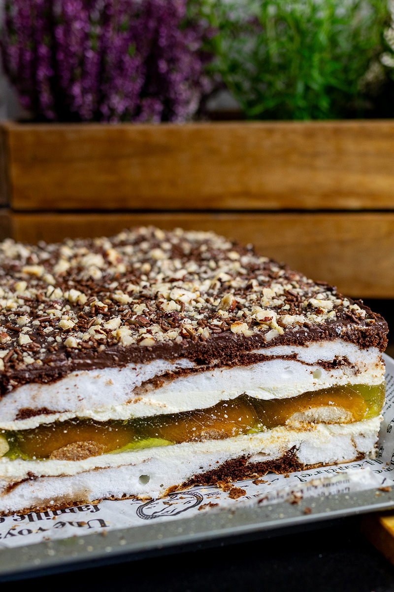 - W wersji z niższą zawartością cukru cukier w cieście zastąp erytrytolem lub ksylitolem (2/3 szklanki do ciasta jasnego + 1/2 szklanka cukru do ciasta ciemnego). Użyj galaretki bez cukru i bezcukrowych biszkoptów. Składniki na bezcukrową polewę: 50 g śmietanki 30%, 80–100 g gorzkiej czekolady 85–100%, 1–2 łyżki erytrytolu pudru.