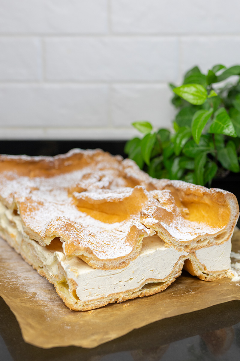 - Wierzch możesz posypać cukrem pudrem. Następnie gotową karpatkę wstaw do lodówki na minimum 4-6 godzin, najlepiej na całą noc.